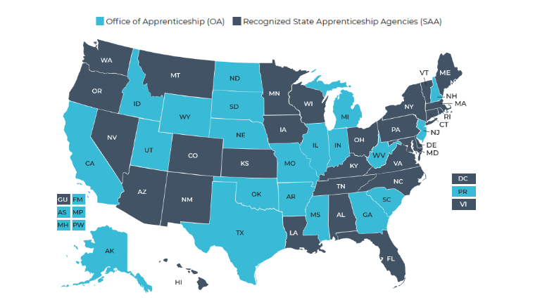 State Apprenticeship Agency (SAA) States have varying processes and policies, depending on each state’s laws and regulations, but all must go through an approval process with the US DOL to be recognized as meeting federal standards. SAA states: